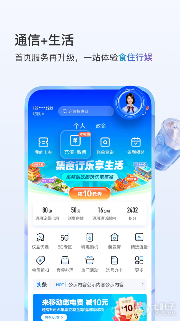 中国移动(原中国移动手机营业厅)是中国移动【官方】推出的手机客户端软件。作为中国移动官方统一入口,中国移动APP为全国移动智能终端用户提供涵盖了移动业务及5G套餐查询办理、话费流量优惠充值、宽带网络申请报障、智能终端及配件选购、积分权益活动等多种功能服务。中国移动致力于为全国广大智能终端用户打造舒适便捷的服务体验,让用户享受简单、快乐的移动“心”体验!