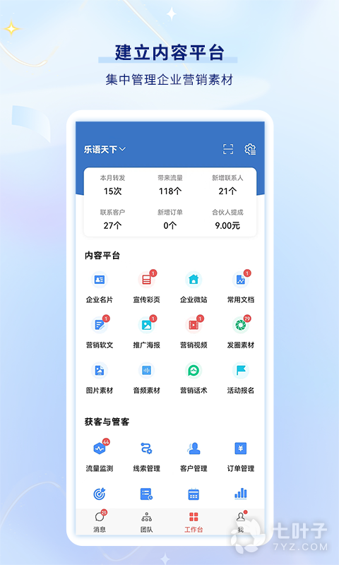 乐语是一款专门给营销人员开发的手机APP,专门给营销人员拓客使用。它集成了个人首页、软文营销、红包营销、商务社交、网络分销、个人客户管理、会员卡管理、积分管理、提现管理等等功能。