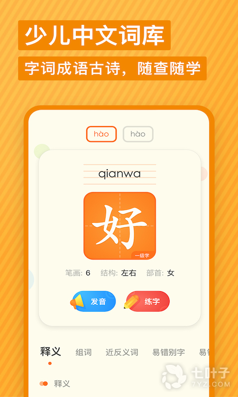 支持中文查字、英文查词,图片词典、汉字笔顺、自然拼读、跟读练习、语音助手等功能,支持单词、汉字、词语、成语、古诗词、固定搭配、教材例句等诸多内容,匠心打造,免费无广告。有道少儿词典依托海量的汉语及英语数据和智能化的语音识别技术,为6-12岁的儿童提供全面、权威的汉语及英语数据和智能高效的查询服务。