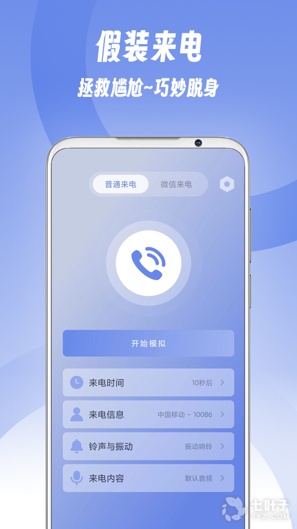 假装来电是一款模拟手机来电话和短信的应用软件,来电界面多种可选,包含市面所有主流机型的来电界面,可以设置时间,来电铃声,可以设置接通后录音或音频播放,假装对话,应用广泛,社交离场,脱离尴尬神器!
