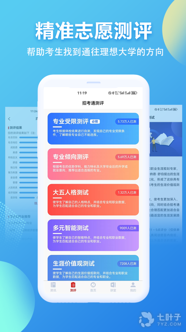 3、在“测评”中可以对自己感兴趣的专业等进行测评;
