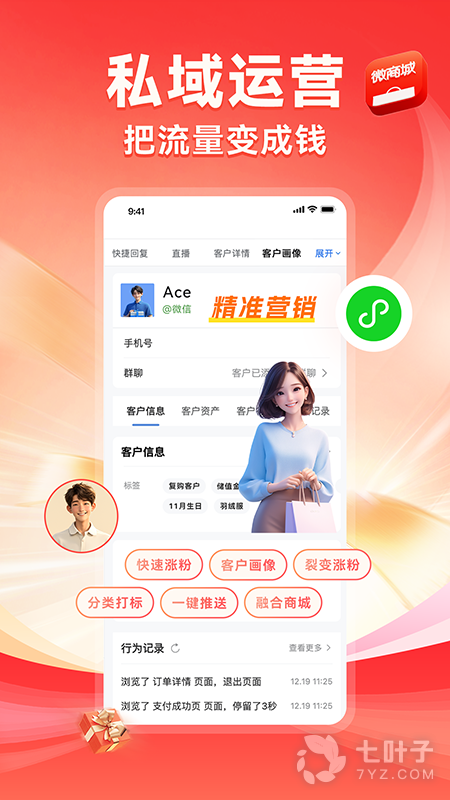 帮助商家建立自己的移动商城,不受电商流量平台的束缚,维护好自己的老客户。包含:客户营销、店铺成交、营销玩法、数据开放、资产管理等多个核心模块。