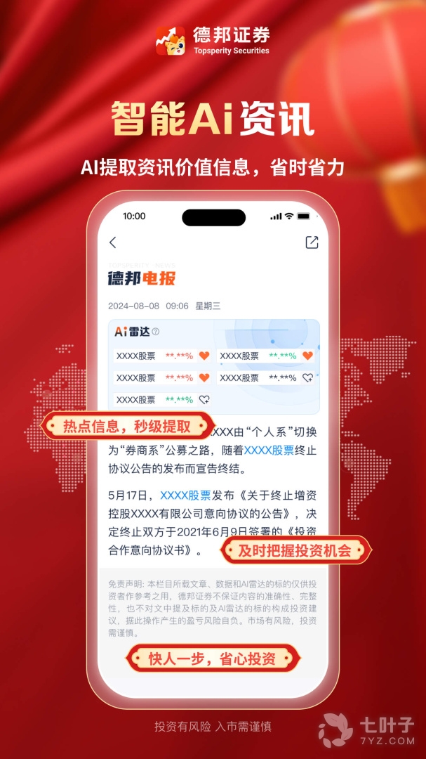 德邦证券是德邦证券为客户倾心打造的全方位投资理财金融平台。集手机开户、高速行情、资讯、普通交易、融资融券、股转业务、(港股通)、金融商城、投资顾问、多银行存管、账户查询、特色化掌厅等功能于一身,随时随地满足客户的各种投资需求。
