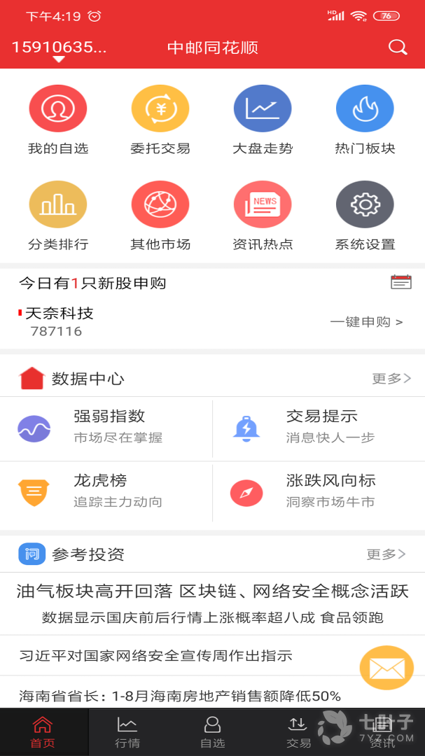 1、这里有我的自选、委托交易、大盘走势、热门板块、分类排行、其他市场、资讯热点等功能板块。中邮同花顺APP汇聚了最权威实时的数据中心,还有众多参考投资资讯