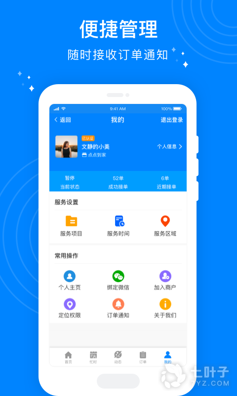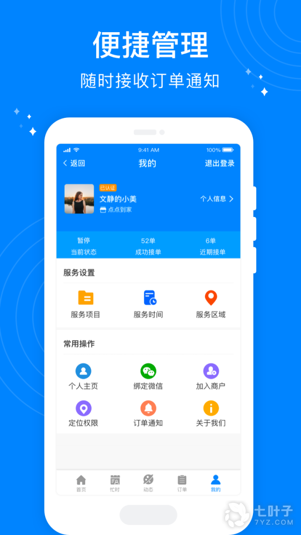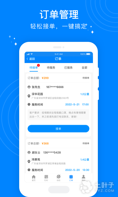 1、可随时查看个人的接单和订单详情,随时与客户进行沟通预约时间