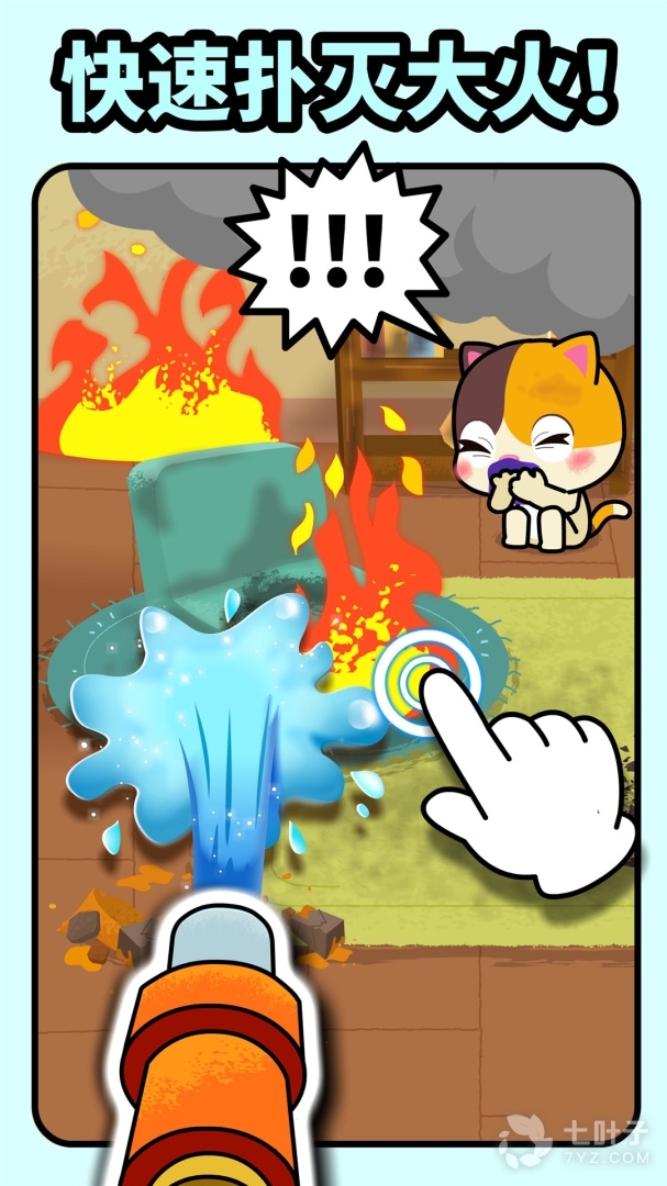3、高楼火灾:先用高压水枪灭火,再用消防斧劈开障碍解救居民!(学会使用消防器材)