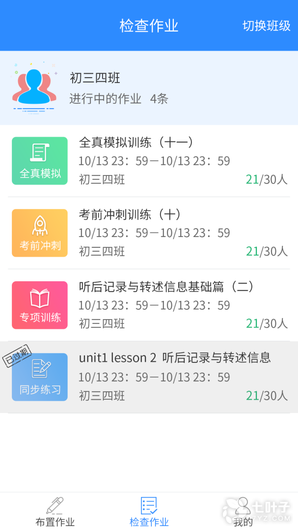 慧听说教师端app中老师可以布置作业和发布学习要求,app有全真模拟、考前冲刺、专项训练、同步练习四大板块供老师选择与发布;同时还可以保存多个班级,实现同时教学不同班级的效果,方便老师进行合理的安排和管理;学生在完成作业后,系统会自动批改作业,老师也可以检查或者点评学生们的作业完成情况,达到智能效率的教学;在批改或测试完成后,系统会将班级完成作业的详细情罗列出来,方便老师了解班上的学习情况。