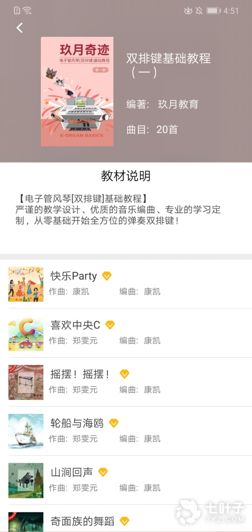 2、共设置7个课程,前6课包括音符介绍及弹奏、随堂练习以及课程测验,第七课包括左右手的综合练习