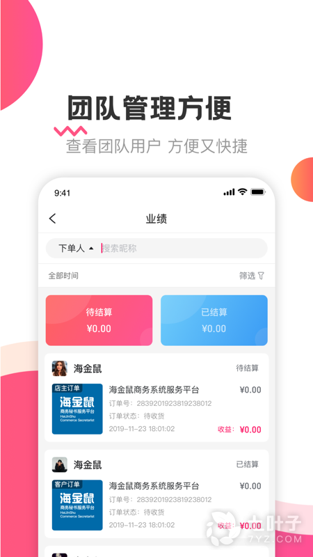 2、海金鼠主要为用户提供商务服务,在这里可以去管理多个店家,实时了解销售情况,在线可以查看团队中的营业数据,无论是店主还是单个客户的数据都可以查看,并且可以在线对业绩奖励进行结算,轻松实现商务管理
