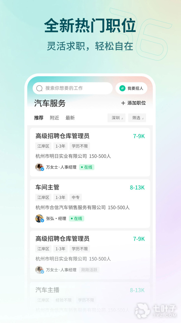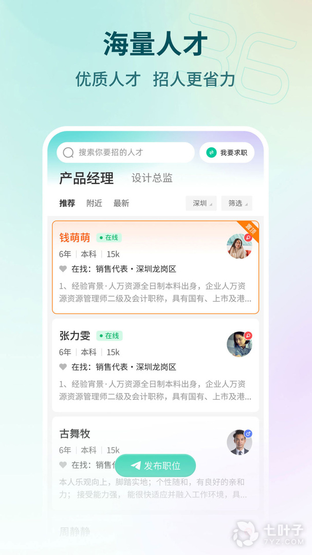 2、该款软件采用领先的移动互联网招聘模式,旨在为用户带来最便捷方便的人才招聘服务,由你来挑老板,支持双向智能匹配、高校招聘等功能