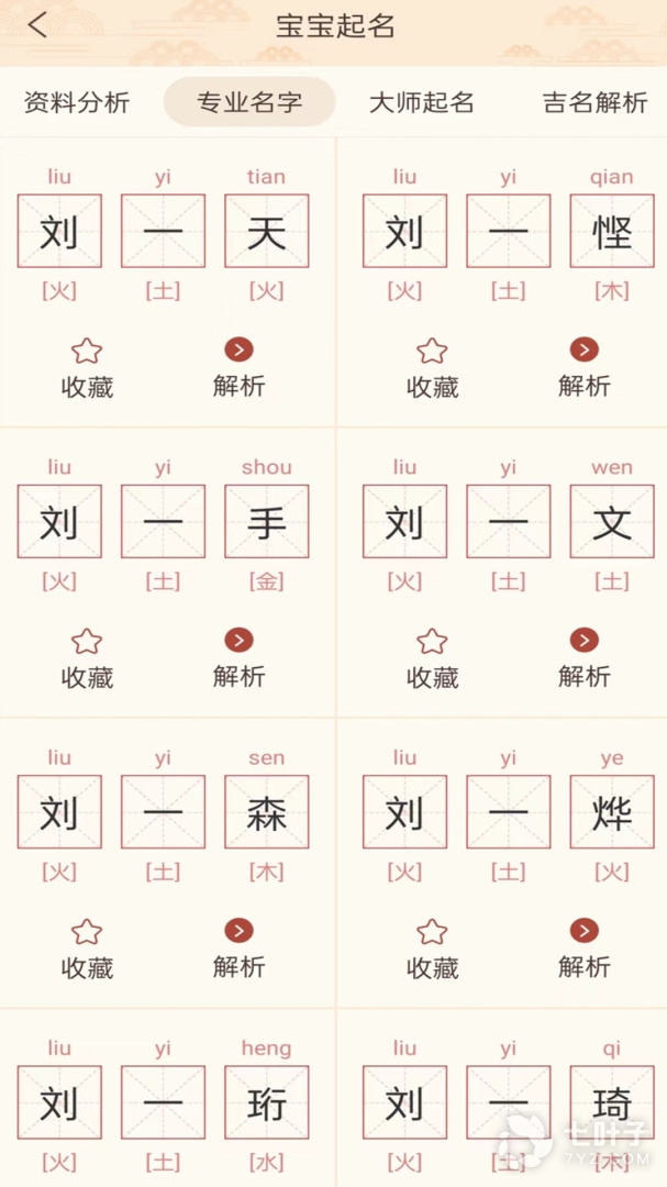 2、起名宝取名大全是新手爸妈必备的宝宝取名工具,软件提供了取名、改名、解名服务,可以为宝宝取一个是寓意良好、重名率低的名字。取名时需要输入姓氏、字数、出生时间、性别,然后软件就会根据这些信息从名字库里挑选合适的名字供用户选择,每个名字都有解析资料哦