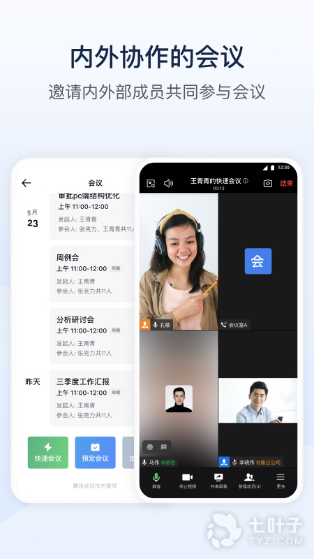 可随时随地发起和参与音视频会议,支持300人同时参会,并为主持人提供了管理功能。发言时还可演示文档或电脑屏幕,支持实时标注演示内容。