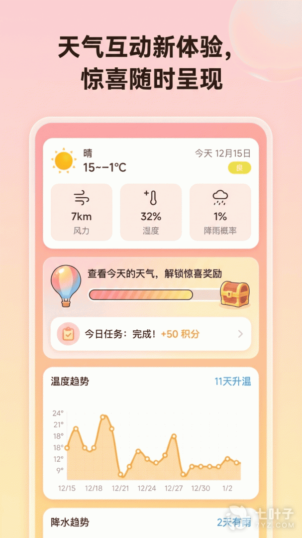 3、趣味天气预报,精准预报未来15天天气信息,气温、天气状态随时查看,获取更详细的天气指数,提供贴心出行提醒,让用户生活、出行更轻松