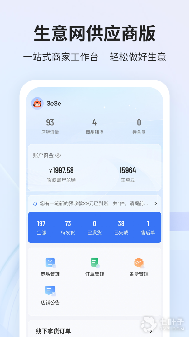 1、生意网厂家版最新版是专为入驻生意网厂家制作,软件拥有店铺管理,商品管理,数据反馈,资金管理等等诸多功能服务