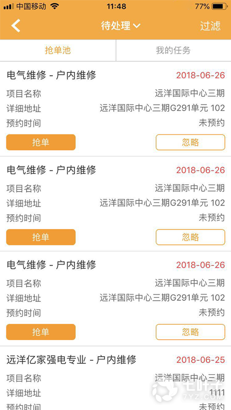 2、工单管理:利用互联网流行的抢单技术,为物业日常处理的公共类、业主类工单进行处理与派发,同时通过手机端移动化处理,实现无纸化办公。提升员工工单处理效率