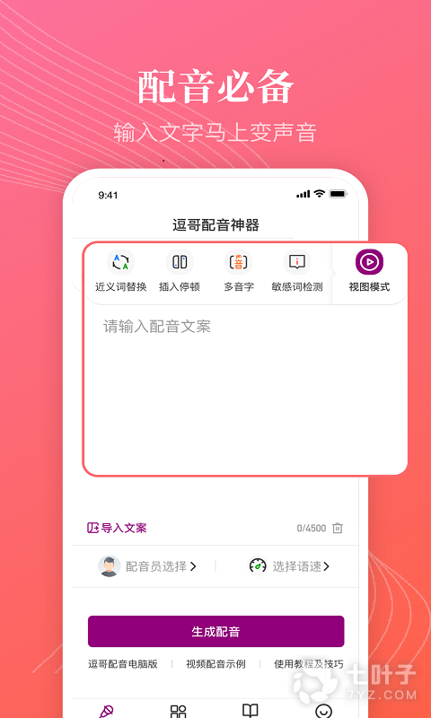 3、用户输入文字内容即可快速配音,拥有男声、女声、萝莉声、大叔声等多种声音可以选择,还能调节语速,操作非常简单实用,是抖音、快手视频拍摄配音必备的工具