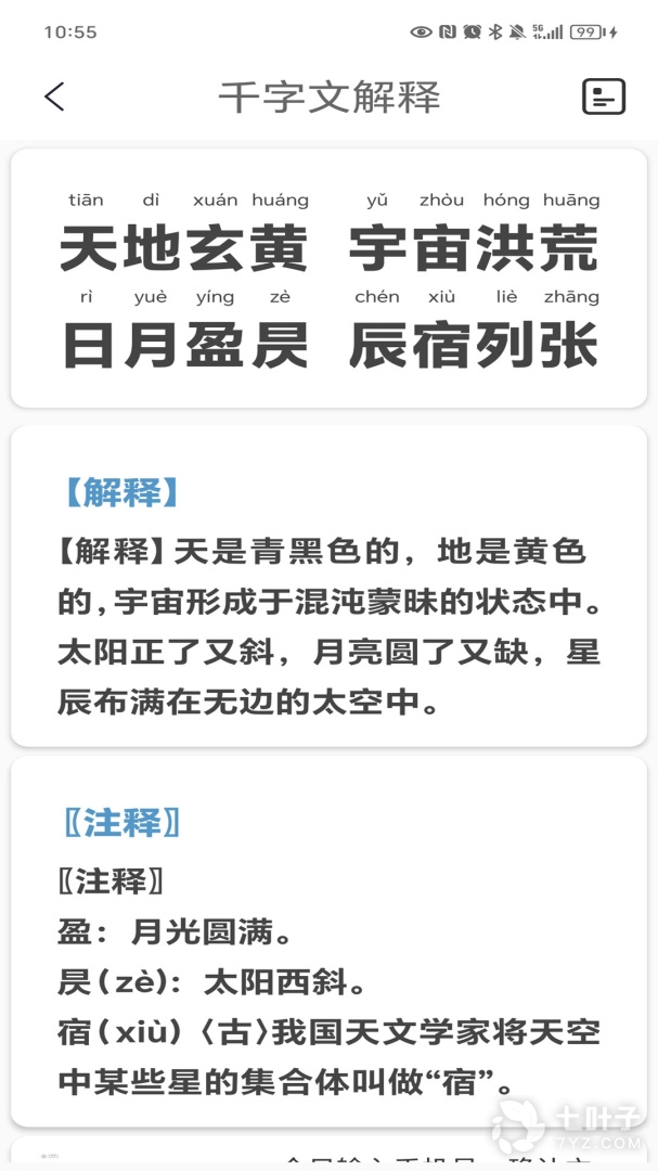 1、天地玄黄,宇宙洪荒;日月盈昃,辰宿列张...这是国学经典千字文的开头,有多少小伙伴幼时是通过千字文识字的呢?千字文是专为儿童汉字启蒙研发的一款国学教育软件,包含完整的千字文文章,并注有赏析注释,孩子们通过它能更好的认字识字写字,开启汉字学习之路
