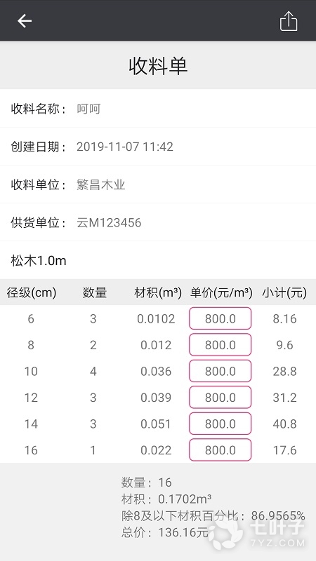 添加收料:能够自定义添加和木材数量单价费用等,方便计算;