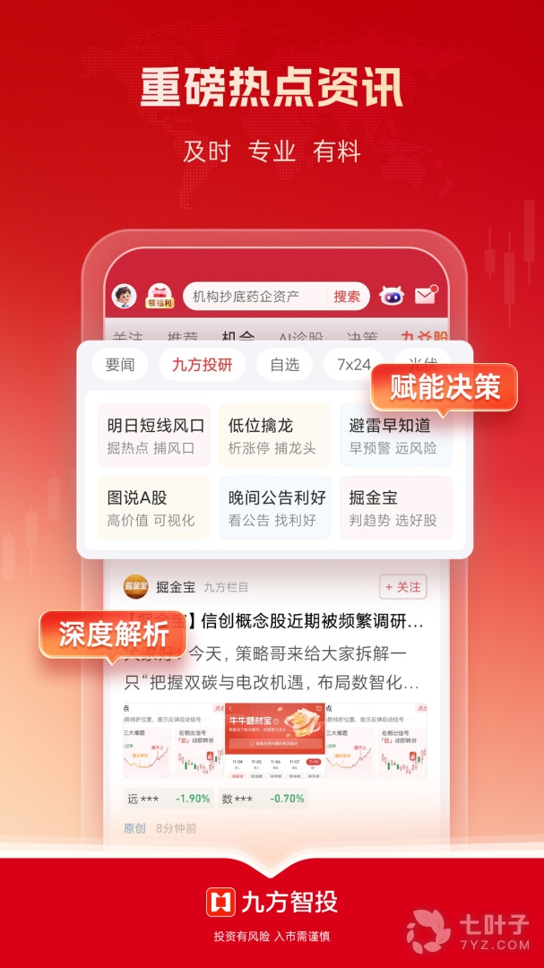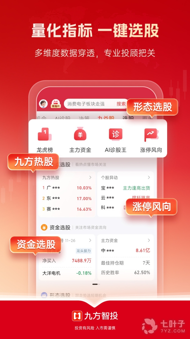 3、九方智投擒龙版是由九方智投官方推出的手机炒股软件,快速精准获取行情,大数据AI算法智能选股盯盘,户籍了海量股市大咖,学习实战方法,丰富的选股工具,量化盯盘即时提供炒股建议,功能完善