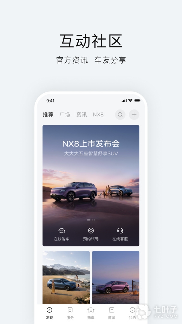 1、提供车系详情及购车优惠政策查询、在线预约到店试驾、在线选配一键定车、实时查看爱车状态、远程控制车辆等服务