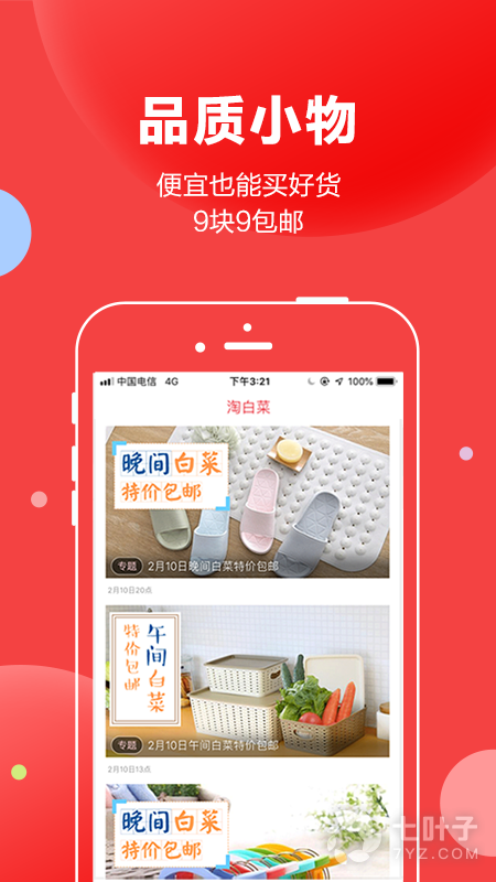 6、主题专场:专业编辑走心准备的专题,贯穿全年,包括圣诞,春节,情人节,母亲节,父亲节,双十一、双十二、海淘、九块九包邮等各种节日假日促销;年会聚会,生日婚庆,春装夏装,厨房浴室,收纳打扫,居家出游,童装育儿,零食百货等各种生活场景;让你的生活更精彩,更轻松