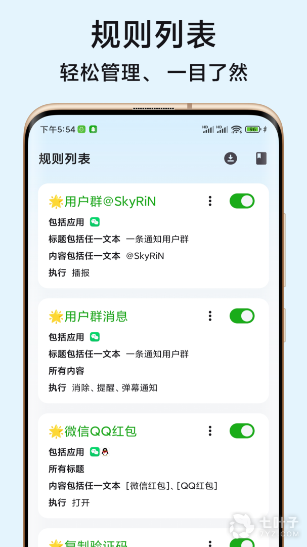 1、一条通知是安卓手机上用于通知功能增强和管理的工具,它可以让你自由的设置手机上各类通知消息的显示,完全自定规则,准确匹配通知并执行一系列操作,并记录通知以及自动执行历史,比如验证码提取、微信QQ通知播报、自动打开通知、通知铃声替换,方便您对通知的灵活管理和使用