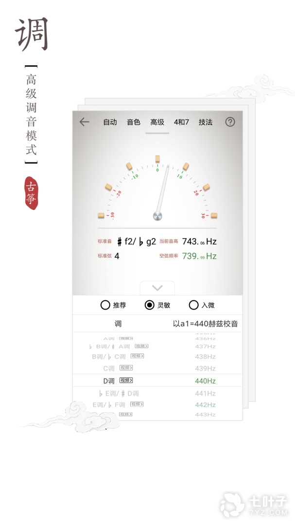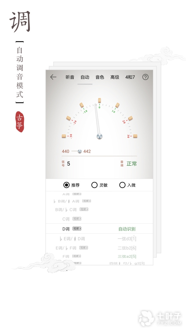 4、调音器提供:听音模式、自动定弦、调音色、十二平均律校音、古筝技法,共5种调音模式