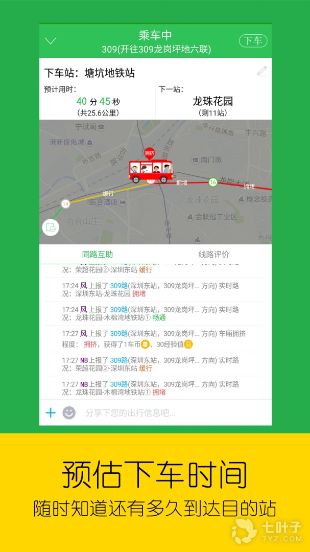 2)成功上车后,系统会自动开启下车提醒功能,同时你还可以对乘车过程服务进价评价,比如:司机或乘务员的服务态度,司机是否违规驾驶,正常停靠站台,以及车厢的卫生,设施等,还可以上报车厢的拥挤度,路段是否拥挤等,不但可以帮助到其他的等人的人,还可以获取系统给予的车币奖励,快速升级哦!
