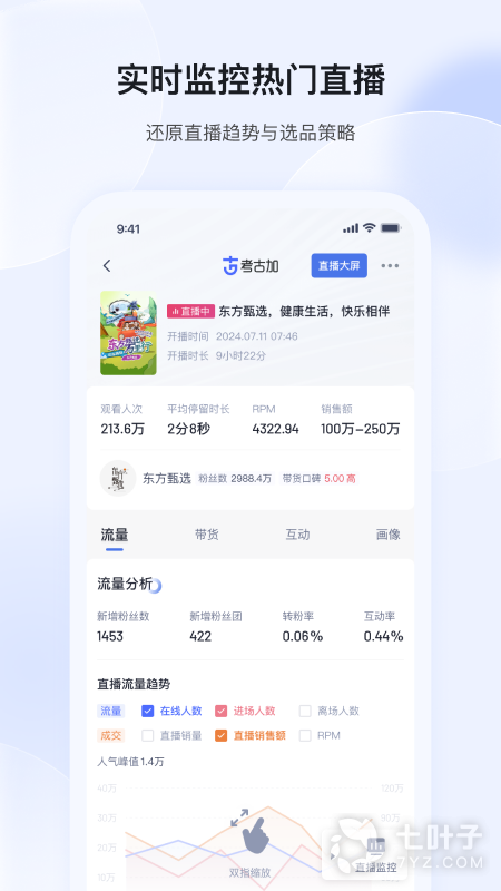 3、直播同步监测流量数据、带货趋势等详细的重要指标