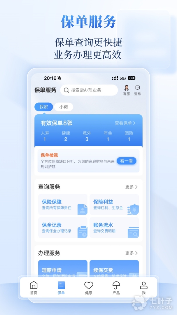 5、提供专业高效的保单智能管理服务,可快速查询保单详情、保障责任及相关权益,随时随地进行保单信息变更、保单借还款、领取生存类保险金、领取保单红利等。另外,还提供在线智能投保、医疗服务及健康管理等服务功能