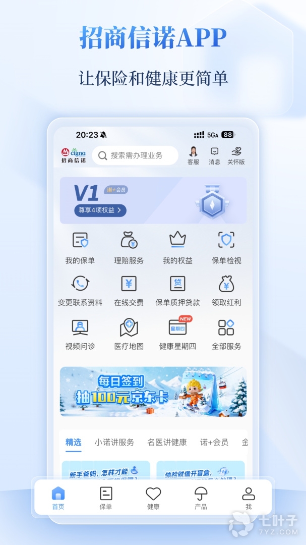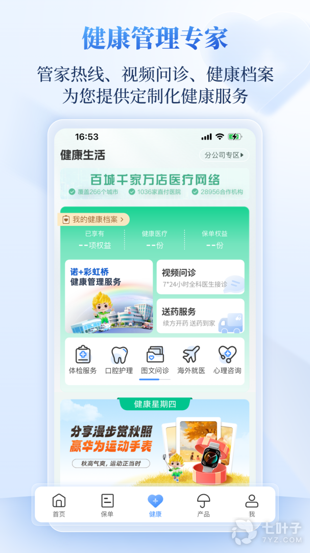 2、关心你,不是说说而已。健康测评,帮助你了解你的健康风险;运动计步奖励,每一步都为你的健康投资