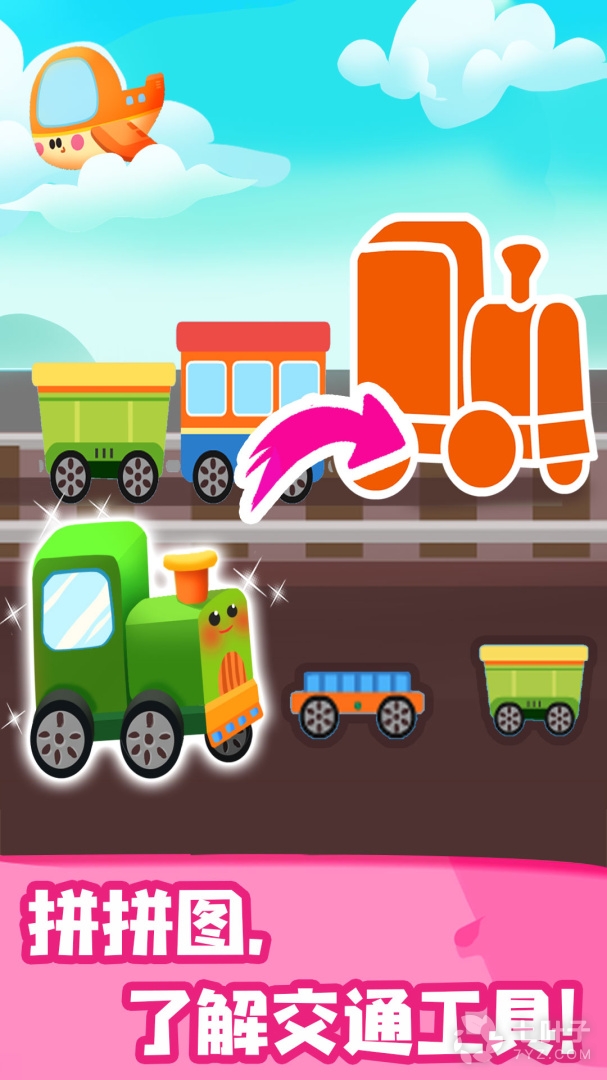 5、拼拼图了解交通工具:宝宝们来拼图啦,工程车、警车、公交车……通过益智拼图,帮助宝宝认知交通工具的外形、名称。放好车身,安装轮子和工具,再加上车头,快看!是一辆消防车哦。