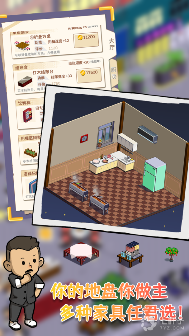 3、深夜的烧烤店让我们找回那个夏天烧烤热闹的景象吧,从游戏一开始的小店,变成远近闻名的网红烧烤店,在这里扩张你的地盘,增加更多的桌子,还需要招募烧烤师傅,更多的菜谱可以让玩家们选择,非常有意思的,一起来看看吧