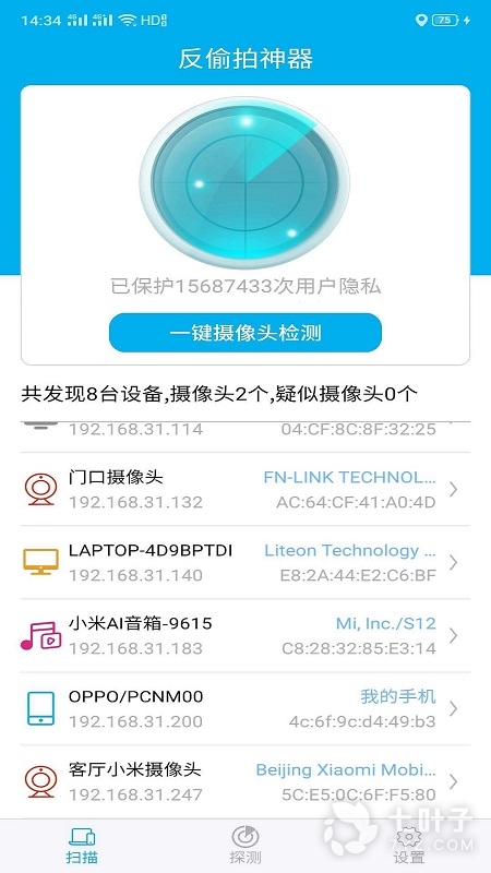 2、现在的针孔摄像头偷拍非常的多,这款软件就能够能够帮助扫描检测摄像头,能够打开手机一键扫描看看是否有针孔摄像头,操作简便,有需要的话就来点击下载吧