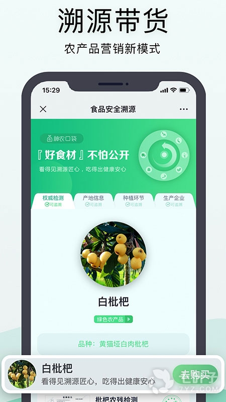 消费者可查看农产品的采摘时间、种植地块、检测报告、农事操作和农场介绍