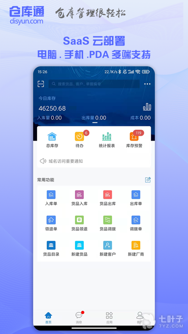 1、消息提醒,出入单、领退单、调拨单、以及盘点单信息及时提醒
