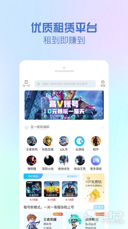 租号玩服务全球的账号租赁平台,3千万用户在通过租号玩进行账号租赁,10万号主在平台出租账号,全平台账号1元可租。覆盖全品类账号端游(lolCF、吃鸡逆战)、手游(王者荣耀、球球大作战、Q飞车)、加速器、影视、音乐等高等级账号,让您安全方便体验高玩的乐趣。