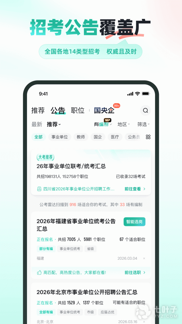 2、全新上线央国企招聘专属板块,整合优质国央企招考资讯,实现精选推荐、实时搜索、精准推送,助力高效报考国央企