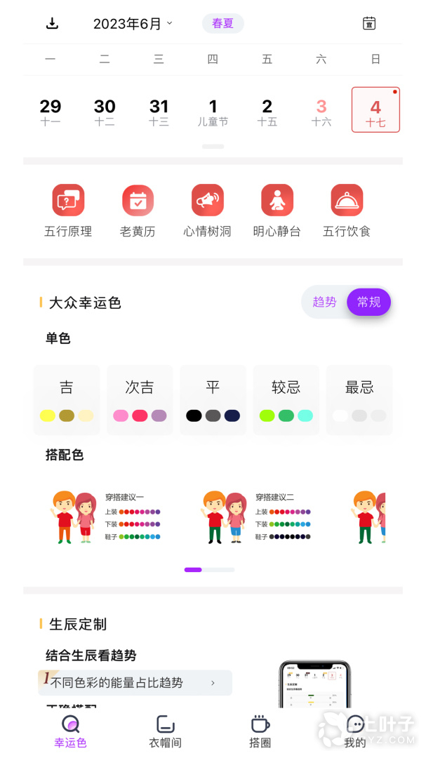 1、在这款五行穿搭软件内,不仅能根据天气气候、生辰八字来为你推荐今天可以穿什么呢,还有适合穿什么颜色的衣服,都会帮你规划好,自己再也无需纠结啦~