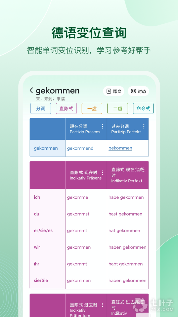 5、轻松查变位,支持德语所有十八种变位形式以及变位反查功能