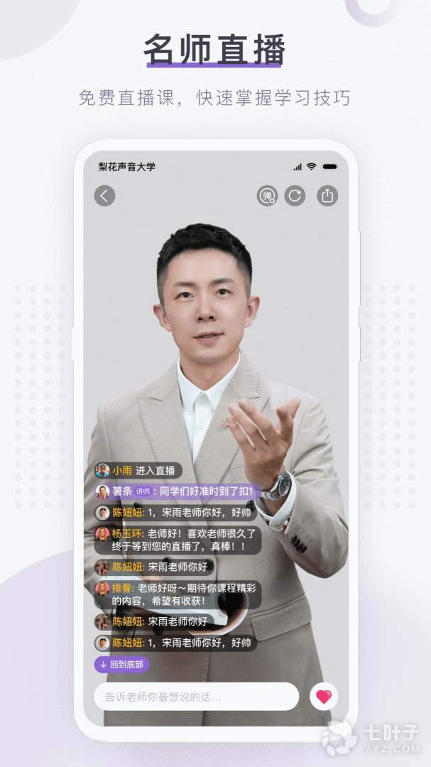 4、梨花声音研修院,这是一个很不错的声音学习辅导平台,这里有很多的学习课程及资源,大家能随时在线学习,平台还有许多优质的直播课程,有专业的老师为大家辅导,帮助大家更快的进步