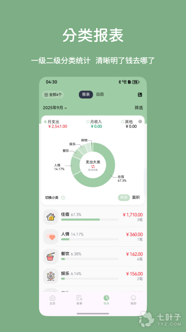 4、支持1级分类、2级分类各种报表统计,轻松知道钱的去向,及时修正消费习惯