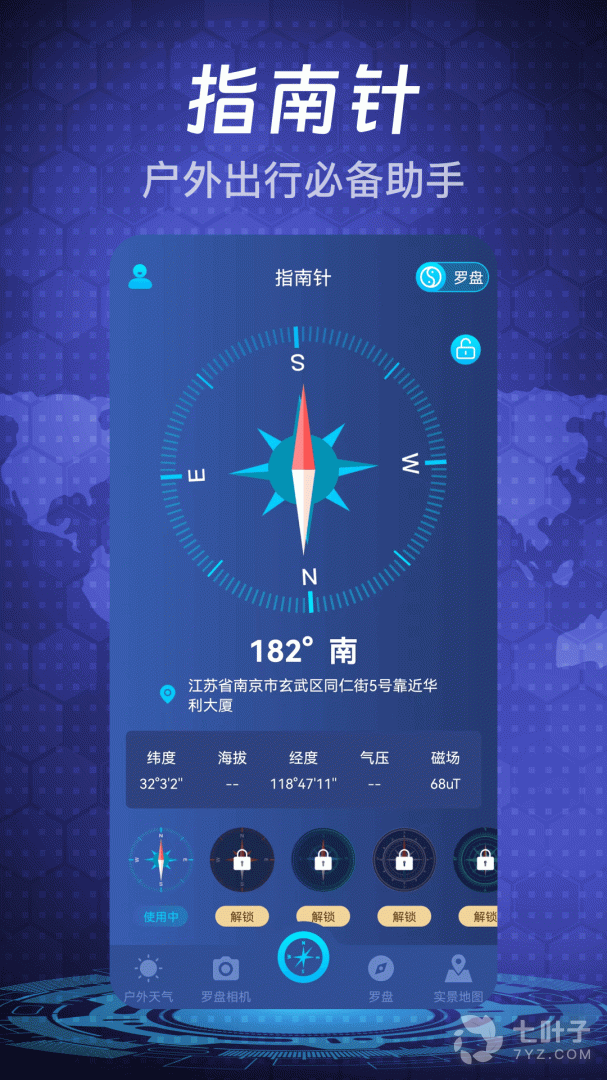 【指南针】支持方向、海拔、气压、经纬度、地理位置、磁场的显示。