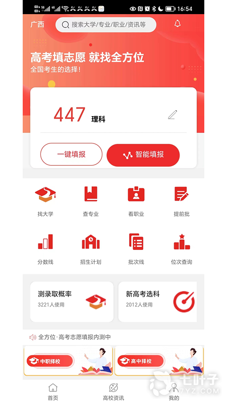 2、从“查、测、填、学、问"五大应用解决考生升学难题3、数据精准根据院校历5年录取分数线、位次和当年招生计划等数据,结合目标专业、高考成绩,运用6大核心算法推荐录取率最高的院校。