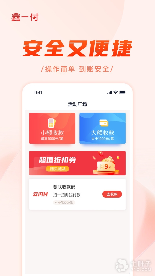 2、鑫一付APP是专为需要网络收款支付的用户打造,为用户提供了二维码收款功能,支持闪付、屏显、手机pay等,收款秒到账,功能非常实用