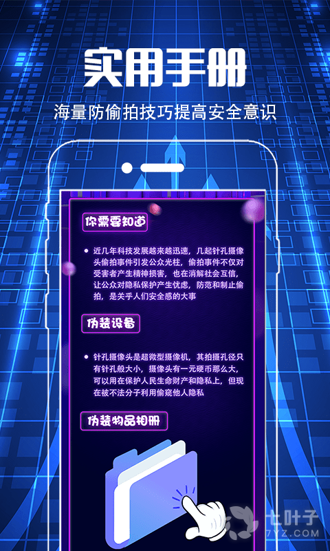 2、这款软件主要是针对需要进行隐私保护的朋友使用,有了这款软件,你就能随时通过软件来扫描周边的是否有隐藏的摄像头,如果有摄像头软件还会为你发生警报哦!软件使用简单,有需要就下载软件体验吧