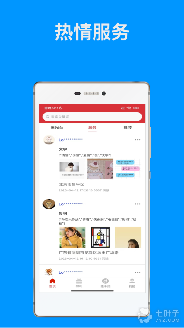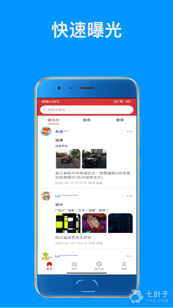 随手拍APP简单方便,一键式操作,多张违章图片快速上传,快速定位当前位置;它能够帮助广大用户高效率的抓拍身边的不文明行为,让老百姓能够积极有效的参与到城市的管理中来,随手拍,随时随地的拍违章的神器。