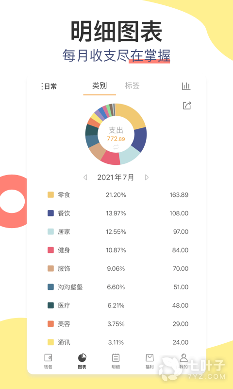 收支构成:给自己的每一笔花销设置一个标签,在每个账单周期中就可以查询到自己各方面花销所占的比例。