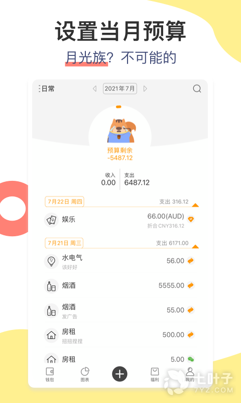 数学不好算不清复杂的账目结果?松鼠支持自动精算,多种分类账单数据具象化展示,距离完成土豪小目标只差1个松鼠记账软件。