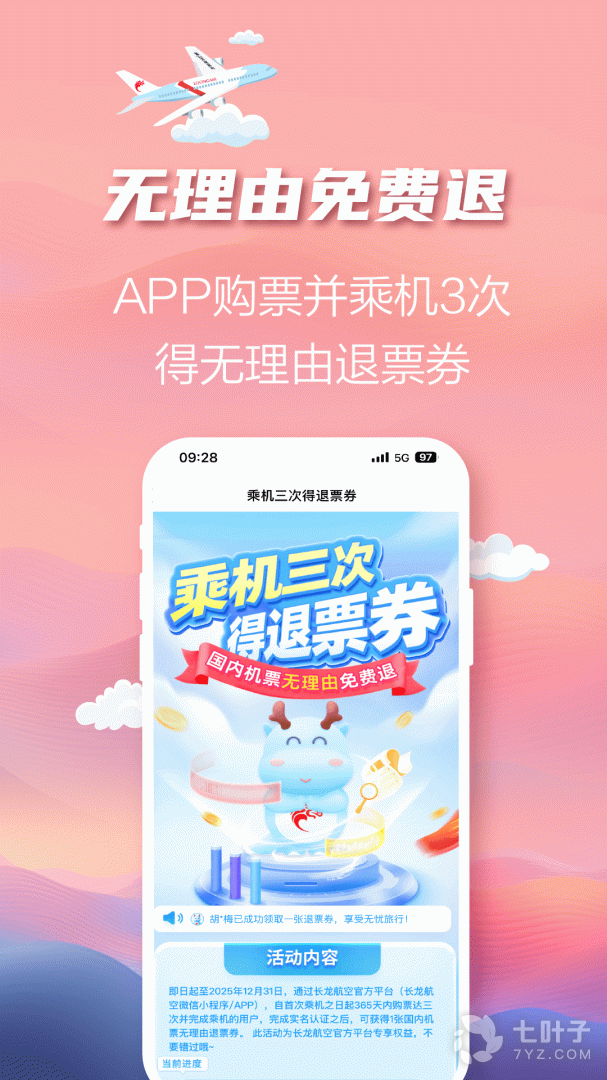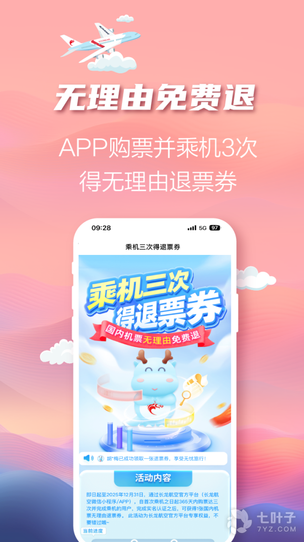 无理由免费退:APP购票并乘机3次得无理由退票券。